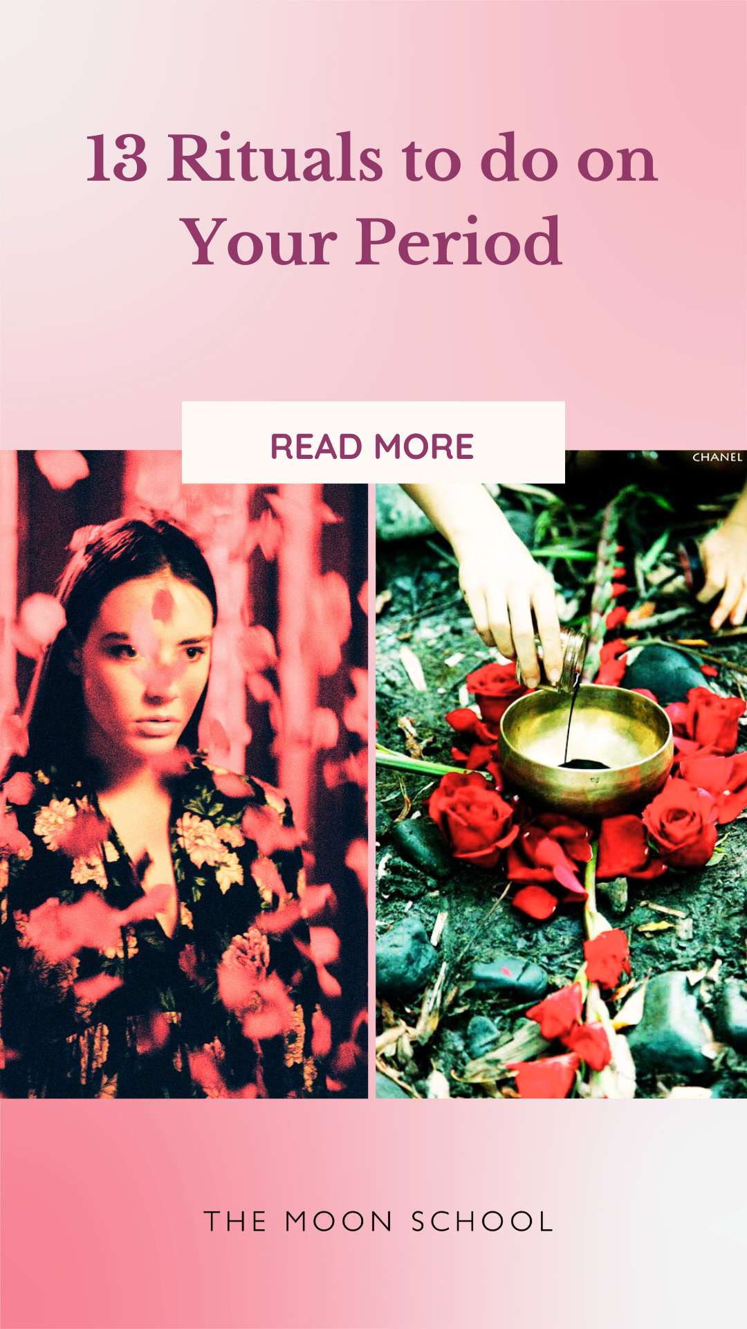 Self-care rituals tend to involve taking time to care for yourself during your period. This may look like taking a relaxing ritual bath with essential oils, practicing some gentle yin yoga or meditation, or simply taking some time to rest and reflect.